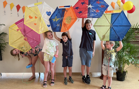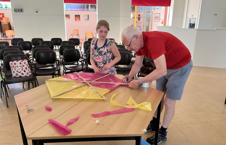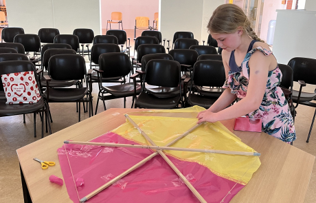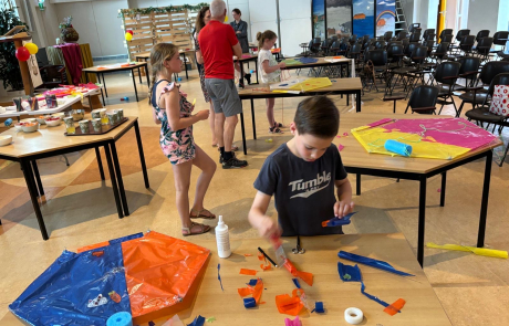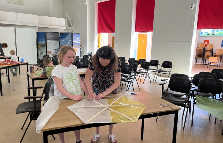 Het frame van de vlieger was al voorbereid, maar de kinderen mochten zelf deze bekleden met vlieger papier. Uiteraard konden ze daarbij zelf de kleuren uitzoeken. Ook de staart en het touw van de vlieger moest zelf worden vastgemaakt. Een lastig en secuur klusje, waarbij een beetje hulp wel handig was.